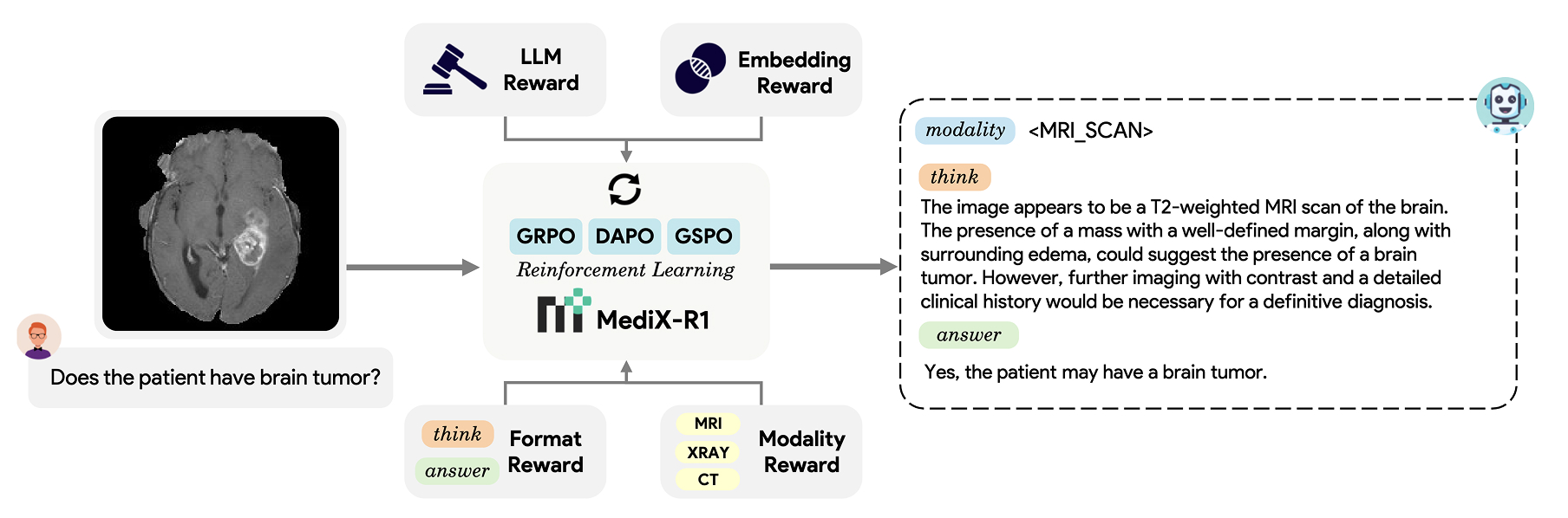 Researchers from MBZUAI and collaborating medical doctors from other institutions have recently introduced MediX-R1, a novel RL framework that can be used to fine-tune multimodal language models and improve their performance on open-ended medical question answering. MediX-R1 addresses a key limitation of standard RL frameworks by employing a reward function that is sophisticated enough to evaluate free-form clinical responses. It can be used with 16 medical imaging modalities, including X-ray, computed tomography (CT), ultrasound, and microscopy and it is compatible with commonly used RL algorithms, including GRPO, DAPO, and GSPO.