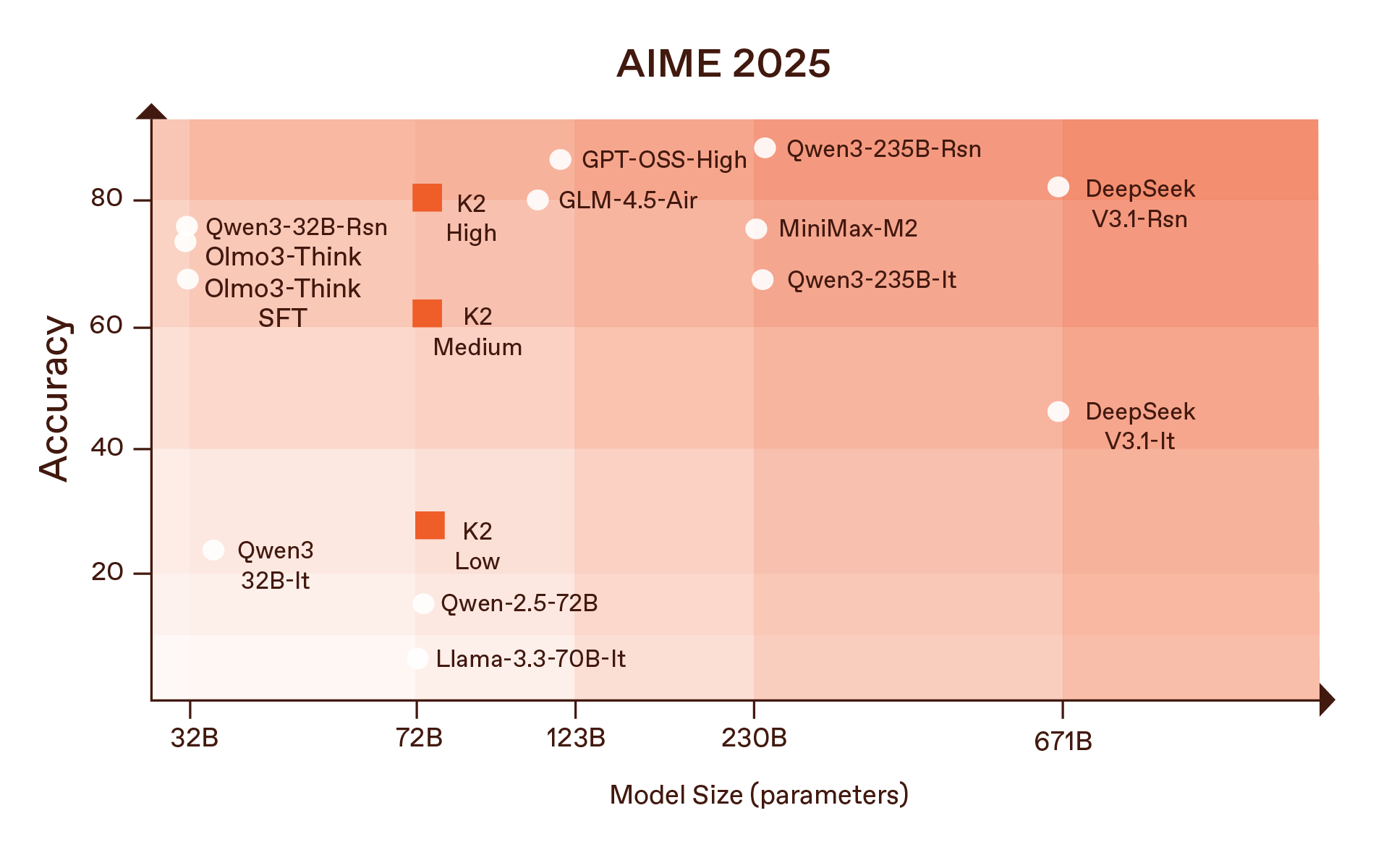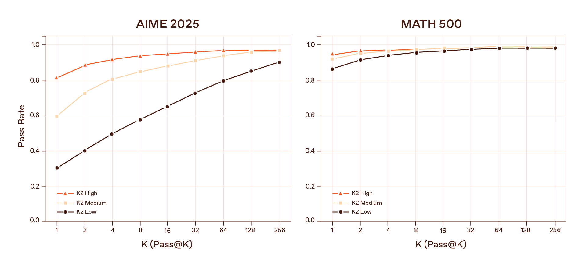 In the fully tuned K2 model, we introduced three “reasoning effort” modes—low, medium, and high—each controlling how many thinking tokens the model generates before answering. High effort delivers the strongest results on difficult math and coding tasks such as AIME 2025, HMMT 2025, GSM8K, and HumanEval.