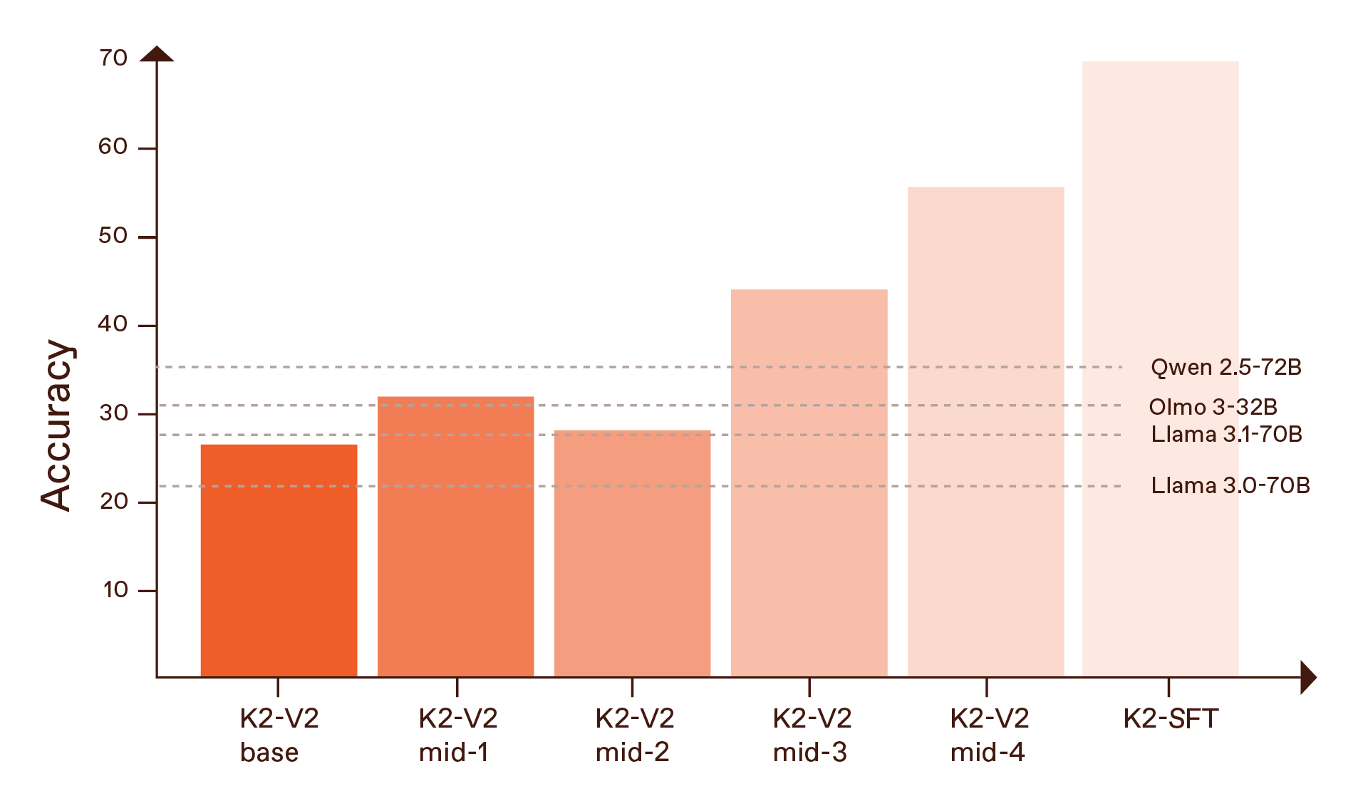As part of our frontier model-focused work at MBZUAI’s Institute of Foundation Models, we are releasing a new version of K2 in a deliberate attempt to push back on that trend. K2 is a 70-billion-parameter, reasoning-centric foundation model designed not just to perform well, but to be fully inspectable. Weights, training code, data composition, mid-training checkpoints, evaluation harnesses – everything is meant to be open. It stands as the strongest fully open model, rivaling open-weight leaders in its size class, outperforming Qwen2.5-72B, and approaching the performance of Qwen3-235B.