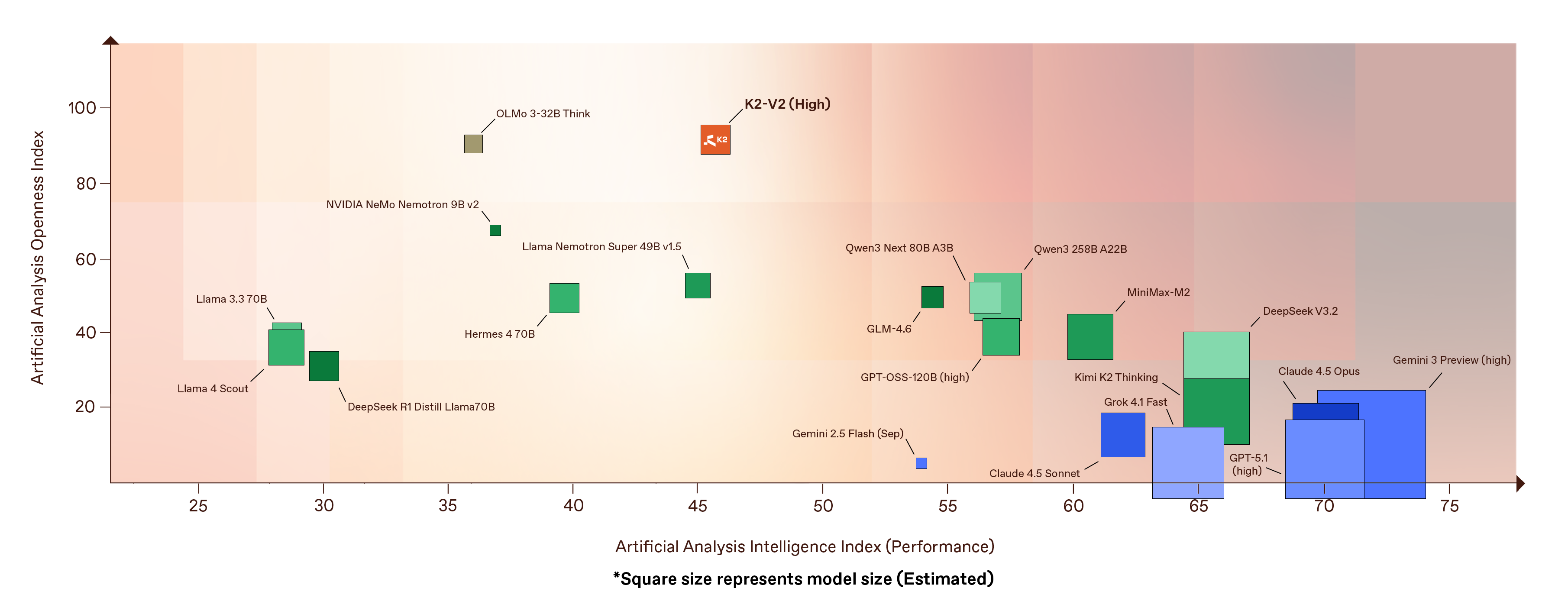 Released on December 6th, K2-V2 is the newest 70B-class model in IFM’s K2 LLM series, and it’s built to change that. It matches leading open-weight performance while taking a “360-open” approach: weights, data, training details, checkpoints, and fine-tuning recipes are all public. Performance without opacity. In practice, this makes K2 the only high-performance open model in the West, and the only fully open-source alternative to the Chinese systems dominating the space.