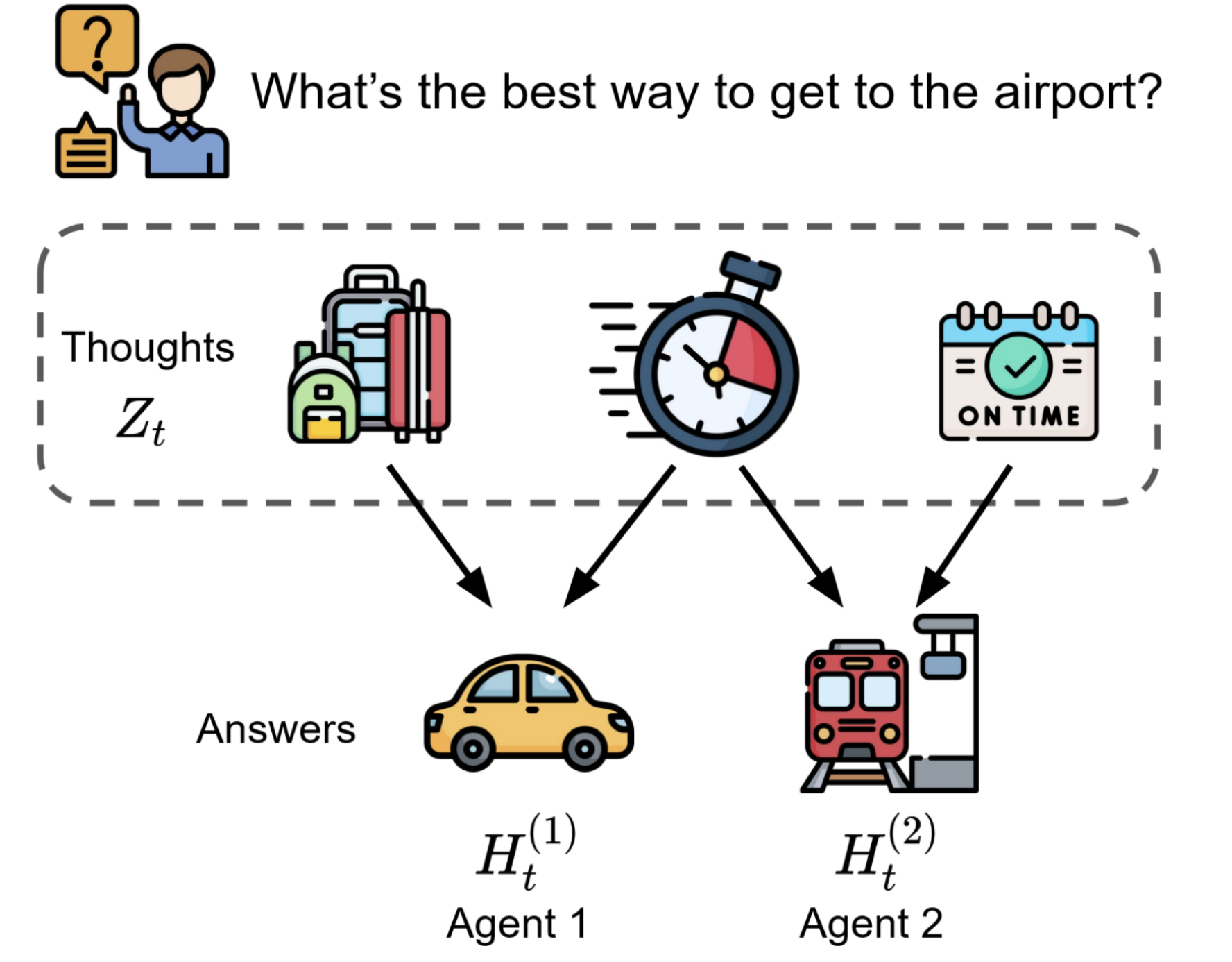 In the study, the researchers illustrate the idea with an example of two agents tasked with determining the best mode of transport to catch a flight. Both agents produce latent thoughts related to speed, but one produces a latent thought about luggage, while the other produces a latent thought about punctuality. This variation leads to different choices by the agents: the one that prioritizes luggage chooses a taxi, while the other chooses a train.