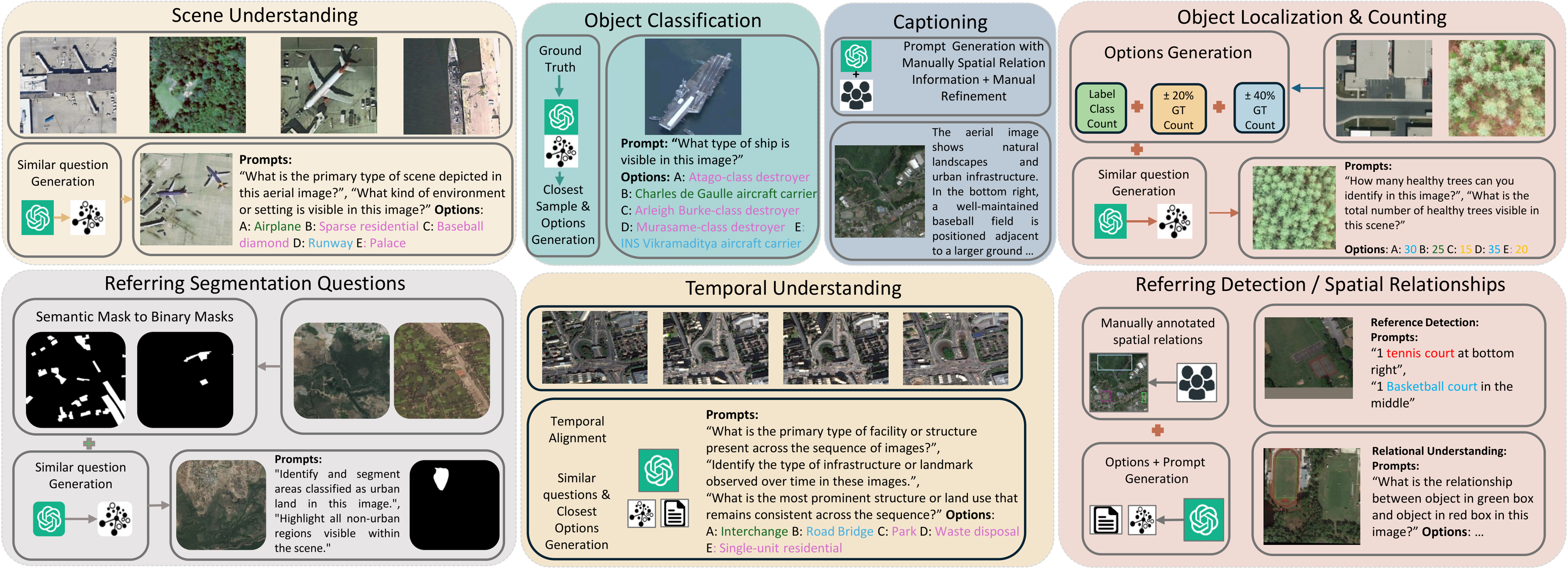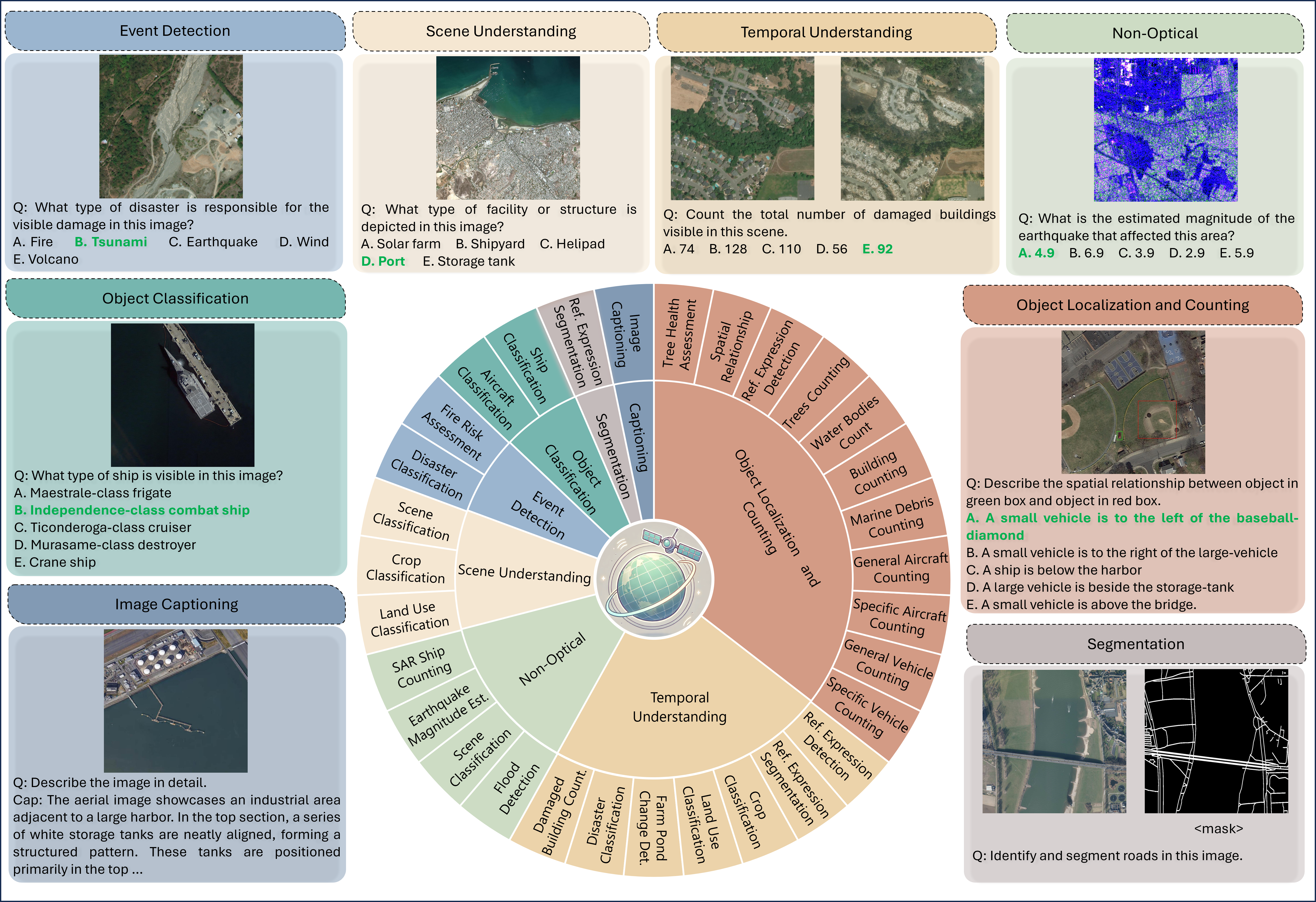 GEOBench-VLM turns that agenda into a sprawling but disciplined test suite. It spans eight task families and 31 sub-tasks, all rooted in the real questions analysts ask of satellite and aerial imagery: scene and land-use classification; object classification (down to fine-grained ship and aircraft types); object localization and dense counting; spatial relationships and referring expressions; semantic segmentation; temporal understanding for change and damage assessment; non-optical sensing (multispectral and SAR); and even captioning for narrative summaries.