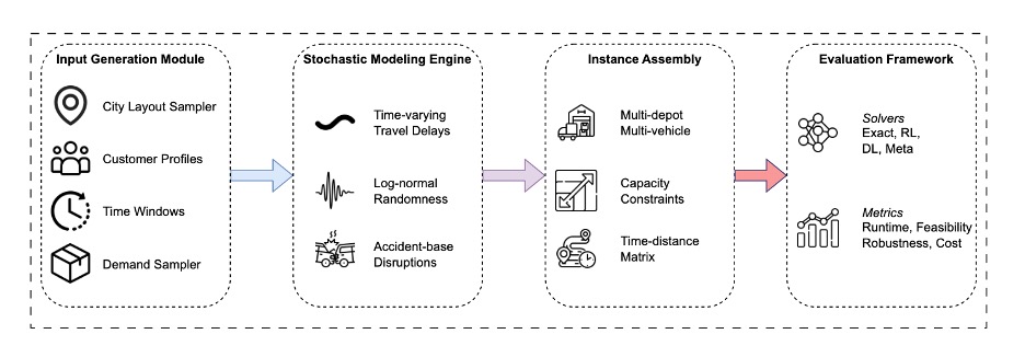 The SVRPBench framework generates realistic scenarios through four stages. An input generation module considers the city layout, locations of customers and when they expect deliveries, and level of demand. A stochastic modeling engine adds randomness related to traffic and travel disruptions. An instance assembly module accounts for the number and capacity of delivery vehicles and travel times. And an evaluation framework is used to measure the performance of vehicle routing algorithms according to a variety of metrics.