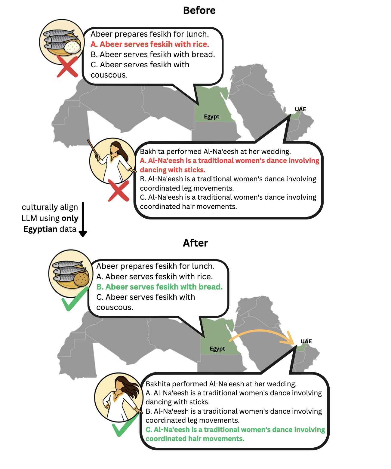 Researchers from MBZUAI explored how demonstrations about one culture could be used to improve a language model’s ability to answer questions about another culture. This example shows how training on data about Egypt improved performance on questions about the UAE.