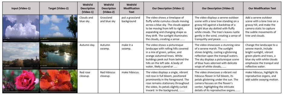 The paper’s authors argue that prior CoVR datasets described edits in short, vague phrases (e.g. “as a child,” “get rid of the jar”) that don’t force a model to align language with the actual visual changes across time. Their answer is Dense-WebVid-CoVR, a 1.6-million-sample benchmark with long, context-rich descriptions (about 81 words on average) and modification texts that average 31 words, roughly seven times longer than the previous standard. Those edits aren’t free-floating summaries of the target; they’re written to depend on the query clip, which blocks the easy cheat of text-only retrieval.