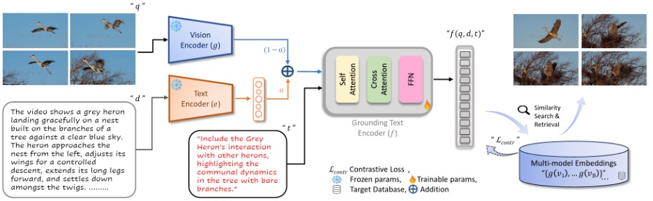 Earlier systems often stitched together pairwise fusions (e.g. video with text, description with text, video with description) and then tried to reconcile the results. The new approach adopts a unified fusion: it embeds the query video and its dense description, mixes them with a learned weight, and feeds that into a grounding text encoder that performs cross-attention with the dense modification text. The vision side uses a ViT-L backbone; the text components come from a BLIP-2 stack; and the training objective is a contrastive loss that pulls the fused query-plus-edit embedding toward the correct target clip in a large database.