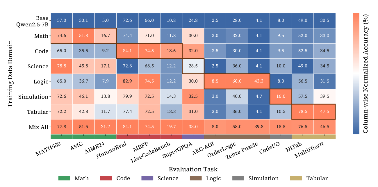 Using GURU, the team trained two models – based on Qwen2.5-7B and 32B – on individual domains and mixed-domain combinations and mapped how reasoning capabilities transfer across them. They started with experiments using 3,000 samples from each domain, training the models on each domain individually and across the six combined. They tested the models on a subset of questions and measured their performance. The results revealed asymmetries in how reinforcement learning influenced performance across the domains.
