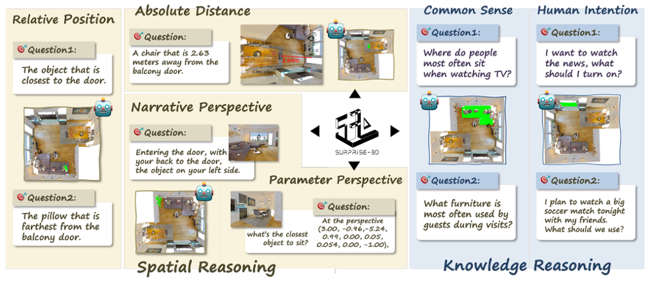 SURPRISE3D builds this into the evaluation from the ground up. It spans 900+ indoor scenes and contributes 200,000+ pairs of language queries and 3D masks, covering 2,800+ object classes. Crucially, more than 89,000 of those queries were written by humans to avoid naming the target object so shortcuts won’t save you. Models must trace relationships, perspective, and distance to find the right instance, not just latch onto a class label. The benchmark also adds 110,000 knowledge-centric queries about common sense and human intention (“the object used to sit,” “what someone might reach for”), but its beating heart is the spatial suite.